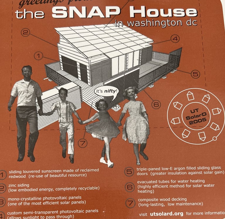 The House was built by UT's students form the school of architecture in 2005 entry in the U.S. Department of Energy's Solar Decathlon competition in Washington, D.C., an international contest in which colleges compete to design the best self-sufficient solar home. After the competition, UT donated the house to Blackland CDC, which paid to have it shipped back from D.C., to its current location, less than a block from where it was first assembled by students. On its west side, East 22nd separates the duplex from a sea of UT parking lots.